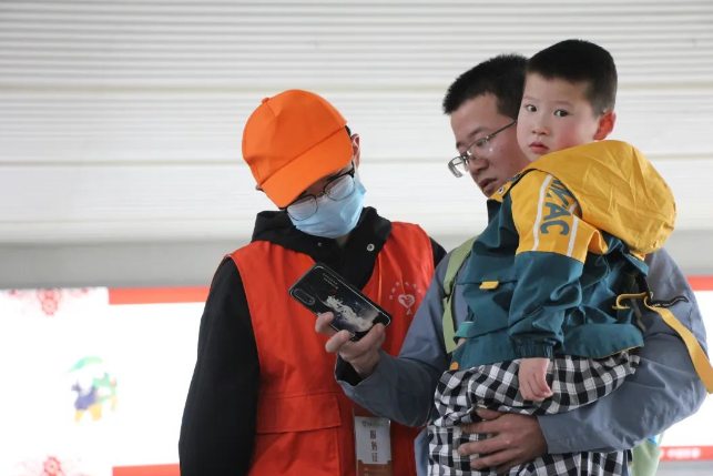 2月21日,恰逢旅客返程高峰,黃山下著瓢潑大雨。黃山市汽車客運總站內(nèi),身穿紅色馬甲的志愿者發(fā)現(xiàn)一名抱著孩子